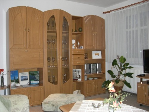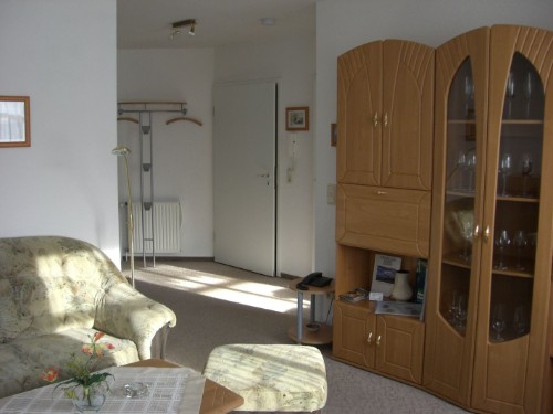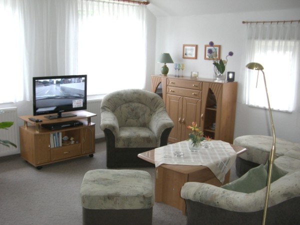 Das Wohnzimmer ist mit einer gemütlichen Sitzgruppe, großer Schrankwand, Sidebord, Sat-TV, CD-Radio und Telefon ausgestattet. Zur Unterhaltung stehen eine Auswahl Bücher und Spiele bereit.