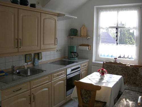 Sie erwartet eine komplett eingerichtete Einbauküche mit Kühlschrank/Gefrierfach, Mikrowelle, E-Herd mit Ceranfeld, Essplatz mit gemütlicher Eckbank.
