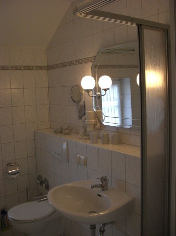 Das Bad mit Dusche/WC ,großem Spiegel, Kosmetikspiegel, Fön und Badschrank